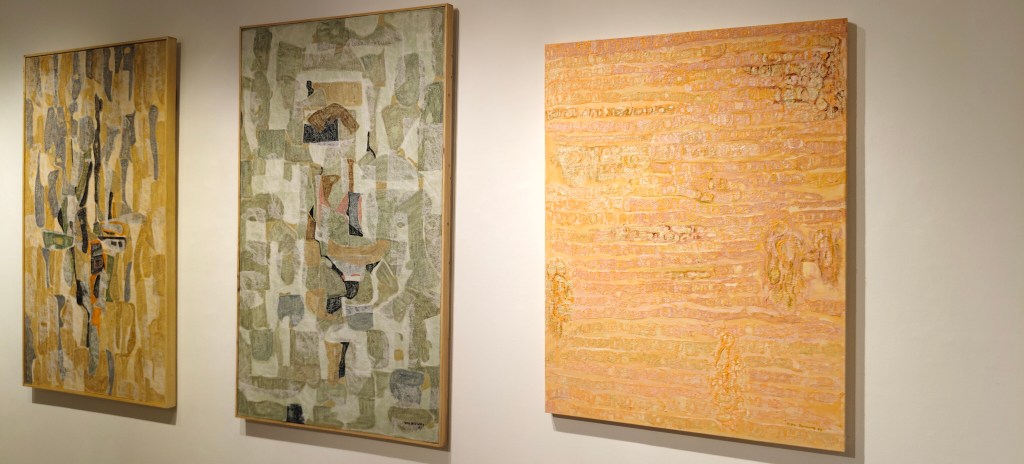 On the other hand, “sense” in her paintings emerges as an underlying logic, even when the work appears spontaneous or chaotic. A subtle order unfolds through compositional balance, rhythm, contrast, and repetition. Even the most intuitive gestures are guided by decisions—where to place visual weight, how colours interact, and when to bring a work to completion.